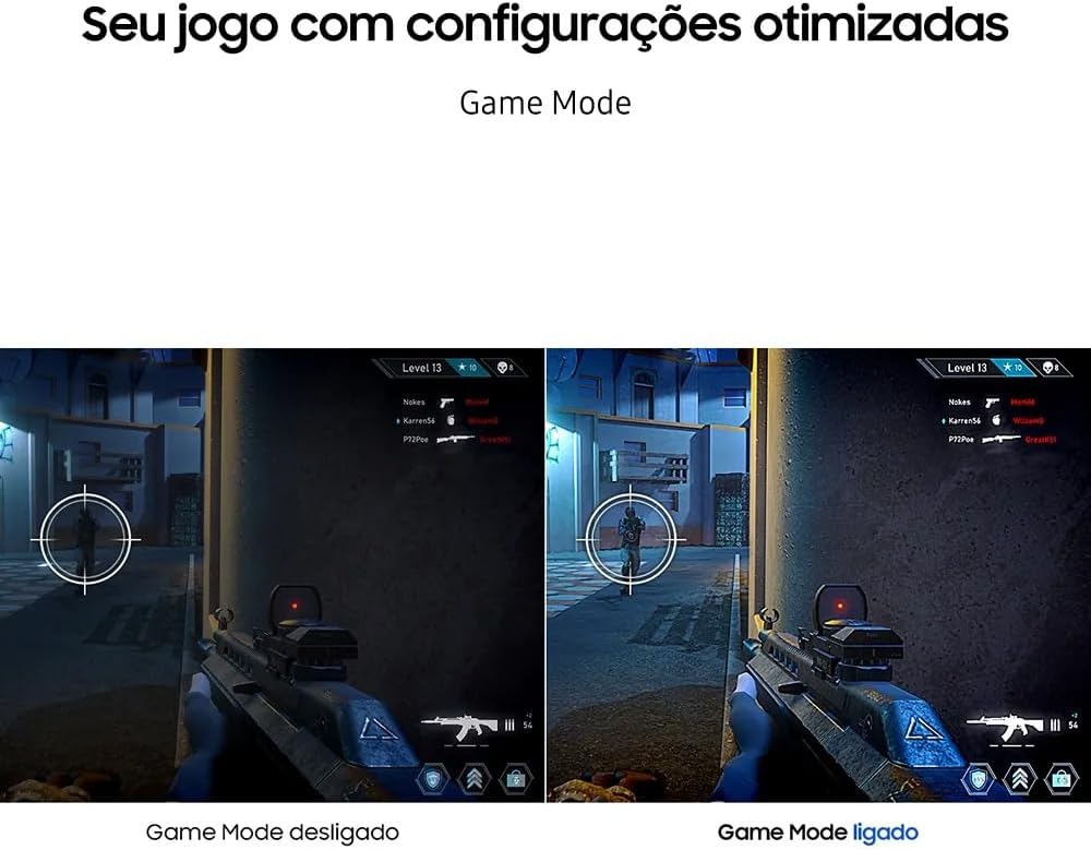 Seu jogo com configurações otimizadas. Game Mode. Configurações de jogo otimizadas, vantagem instantânea. O Game Mode ajusta qualquer jogo para preencher sua tela com todos os detalhes à vista. Seus jogos com cores vivas e maior contraste de imagem para detectar inimigos escondidos no escuro.