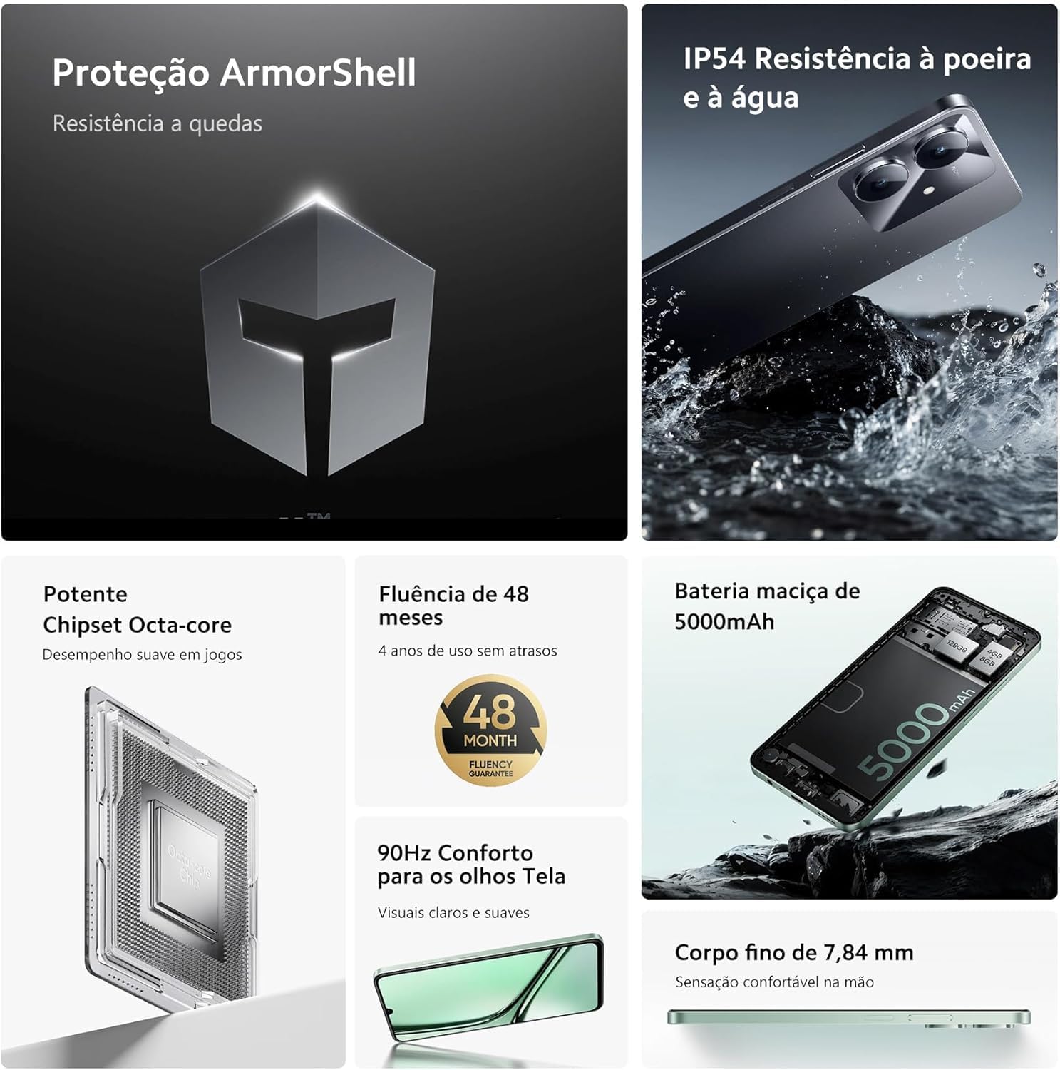 Ultra-resistência com a proteção ArmorShell, fluência de 48 meses com o potente chipset Octa-core, bateria de longa duração com a enorme bateria de 5000 mAh, imagens nítidas e suaves com a tela de 90 Hz Eye Comfort.